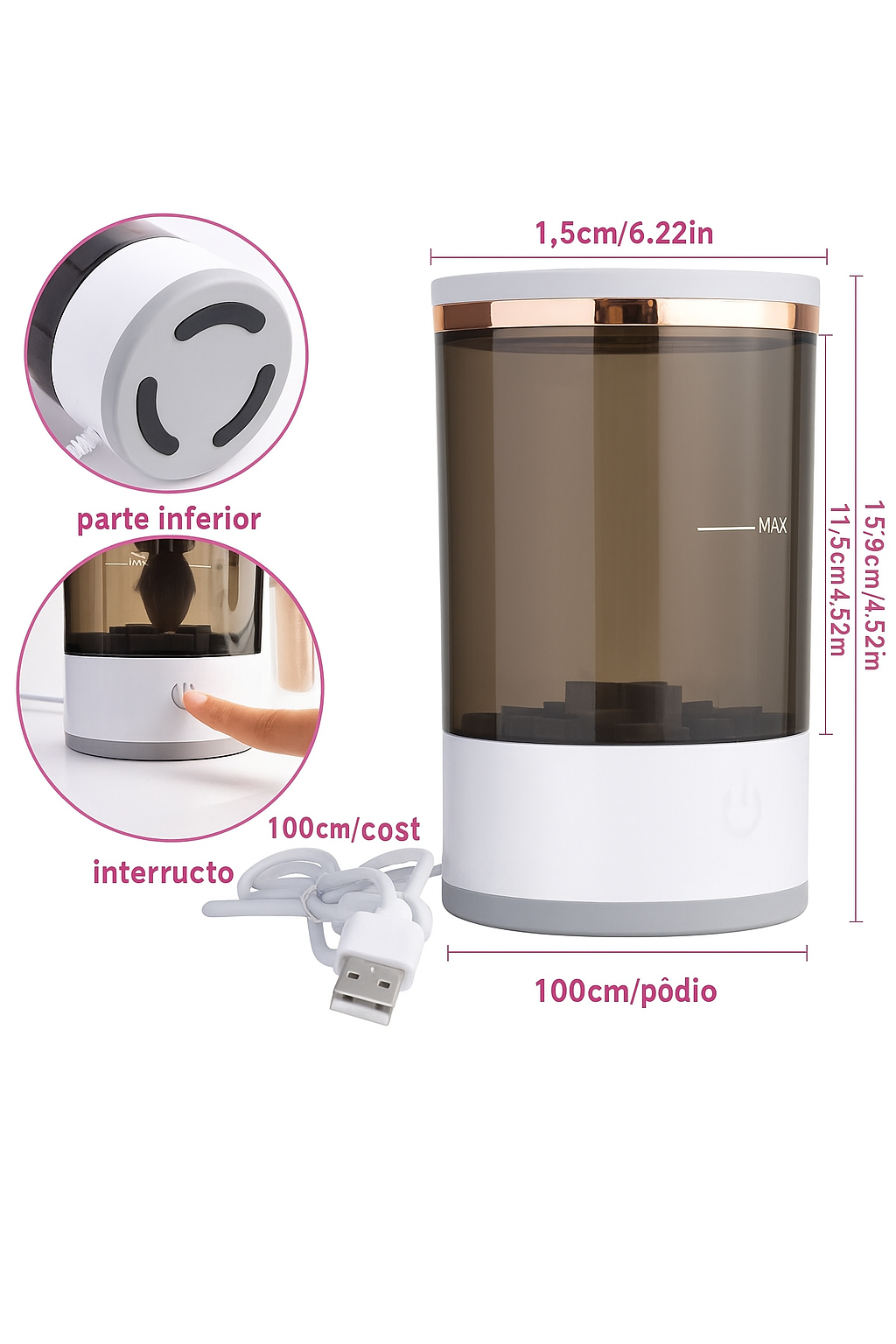 - 👌 Fácil de usar y transportar: conecta el dispositivo, limpia las brochas y listo, gracias a su tamaño compacto.